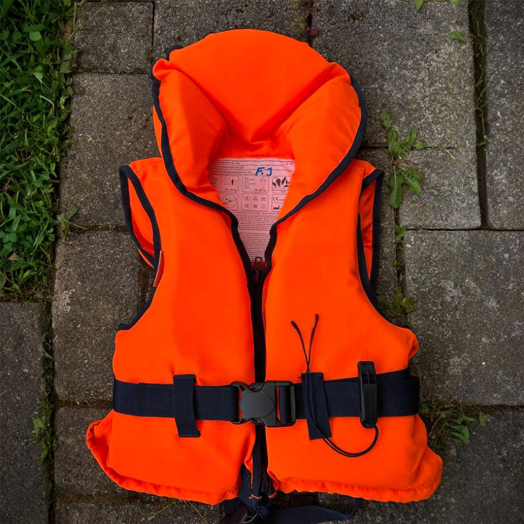 تجهيزات السلامة: مزودة بسحاب بلاستيكي ناعم، حزام بين الفخذين، حزام للخصر، ورباط للصدر. لون برتقالي فاقع مع شرائط عاكسة وصفارة طوارئ.